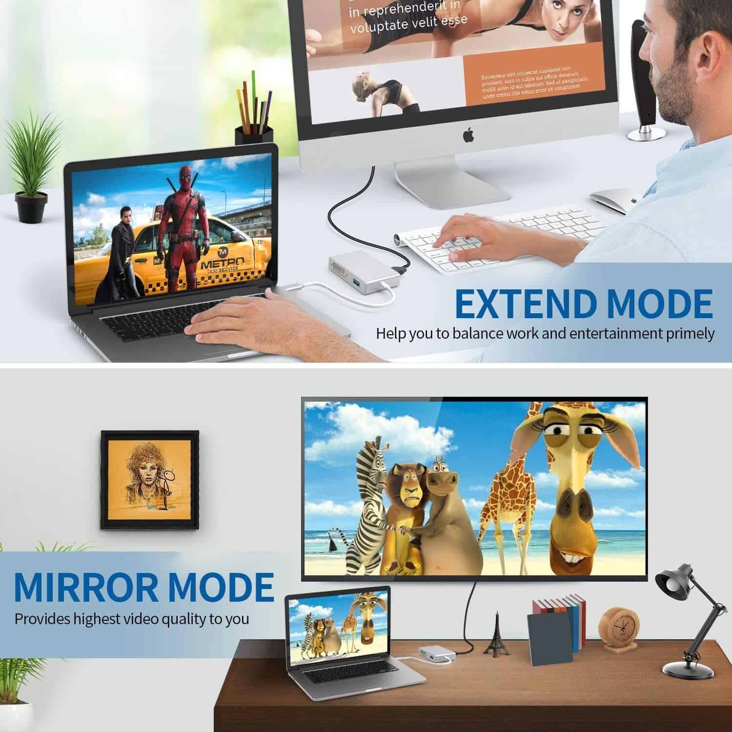 Convertisseur 4 en 1 USB-C : USB 3.1 (type C) vers Multiport HDMI VGA DVI avec Hub USB 2.0 pour connecter un PC/ordinateur portable à des écrans HDMI/VGA/DVI. Plug and Play. Pas de pilote ou adaptateur d'alimentation nécessaire. Vous pouvez partager plus de bonheur et de beauté avec vos amis et votre famille.